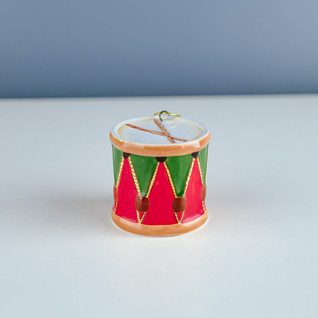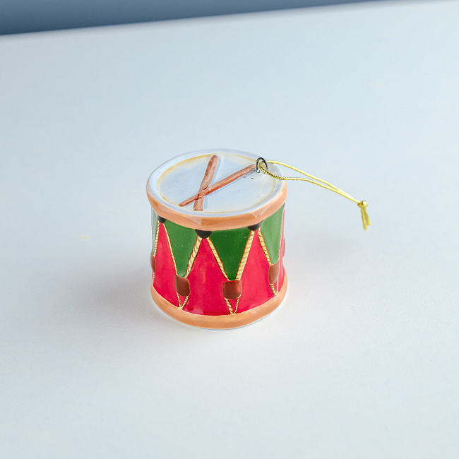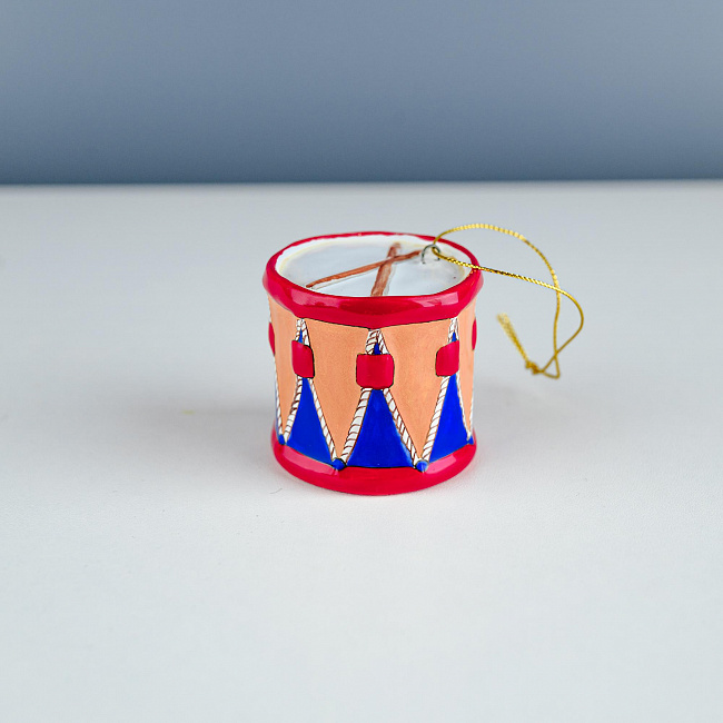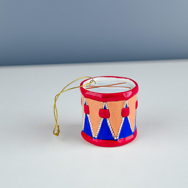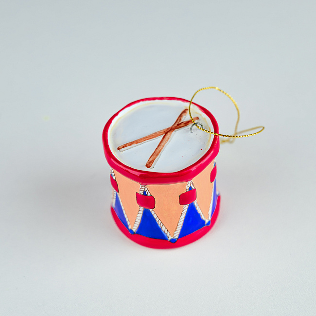 Изделие выполнено в технике майолика, материалы: красная глина, белая глазурь, высокотемпературный обжиг, ручная художественная роспись. Ёлочная игрушка Барабан ручной работы, входит в коллекцию Музыкальные инструменты. О барабане мечтает каждый ребенок, нарисованные барабанные палочки, как будто ждут своего маленького виртуоза. Звуки Барабана, кажется, вот-вот наполнят энергией и объединят сердца единым ритмом. Художник изобразил звонкими цветами яркую чудесную детскую мечту. Улучшить настроение, пробудить и укрепить твердость духа, поможет вам и вашим близким наш замечательный барабан, который будет чудесным украшением новогодней елочки, замечательным подарком, подойдет для оформления интерьера как дома, так и музыкального салона, порадует коллекционеров.